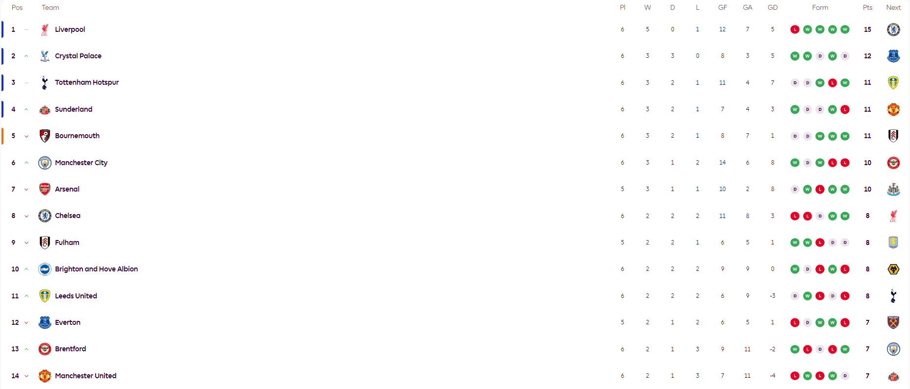积分榜格局剧变:利物浦领跑优势缩水,水晶宫成唯一不败