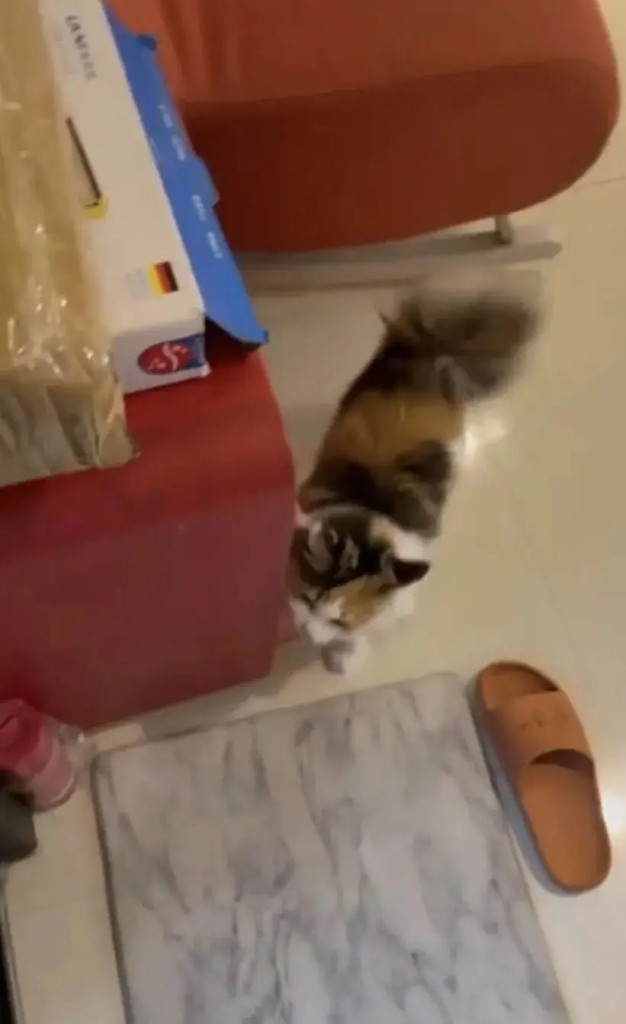 呜比是一只拥有华丽长毛的三花小公主,平时温顺可爱,但一到下雨天,它的“叛逆”属性就会彻底爆发。Alex每次准备出门拿外卖时,刚拿起钥匙,呜比就会像雷达启动一样,瞬间从沙发上弹起,以百米冲刺的速度冲向门口。它的目标很明确:抢占门口C位,伺机“越狱”。