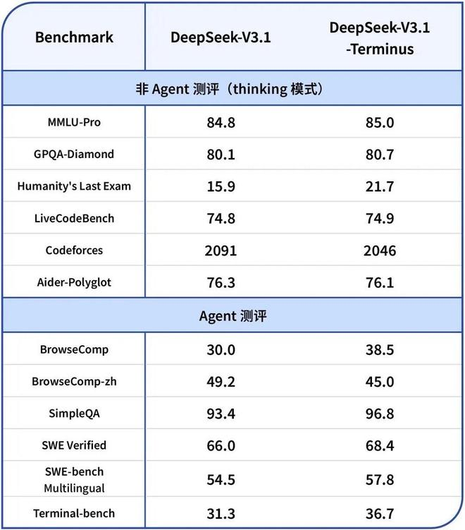 从官方公布的基准测试对比数据来看,DeepSeek-V3.1-Terminus 在非 Agent 类测试项目中,相较于前作 DeepSeek-V3.1 实现了 0.2%-36.5% 不等的性能提升。尽管在个别测试中成绩略有下滑,但整体表现呈现出显著进步。尤其在 HLE(人类终极测试)中,DeepSeek-V3.1-Terminus 的优势尽显。该测试聚焦于专家级高难度知识,以及模型的多模态理解与深度推理能力,模型在此项测试中的大幅提升,进一步印证了其在复杂任务处理上的卓越能力。