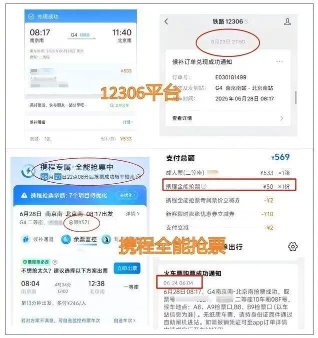 江苏省消保委的实测结果令人震惊——在南京南至北京南G4、南京南至秦皇岛G1236两条热门线路上,12306官方平台的候补功能均最早成功出票,部分第三方平台虽然最终抢到票,但出票时间明显滞后于12306,更有部分平台全程未能抢到任何车票。这一结果直接否定了第三方平台”加速包能提高成功率”的核心宣传点。