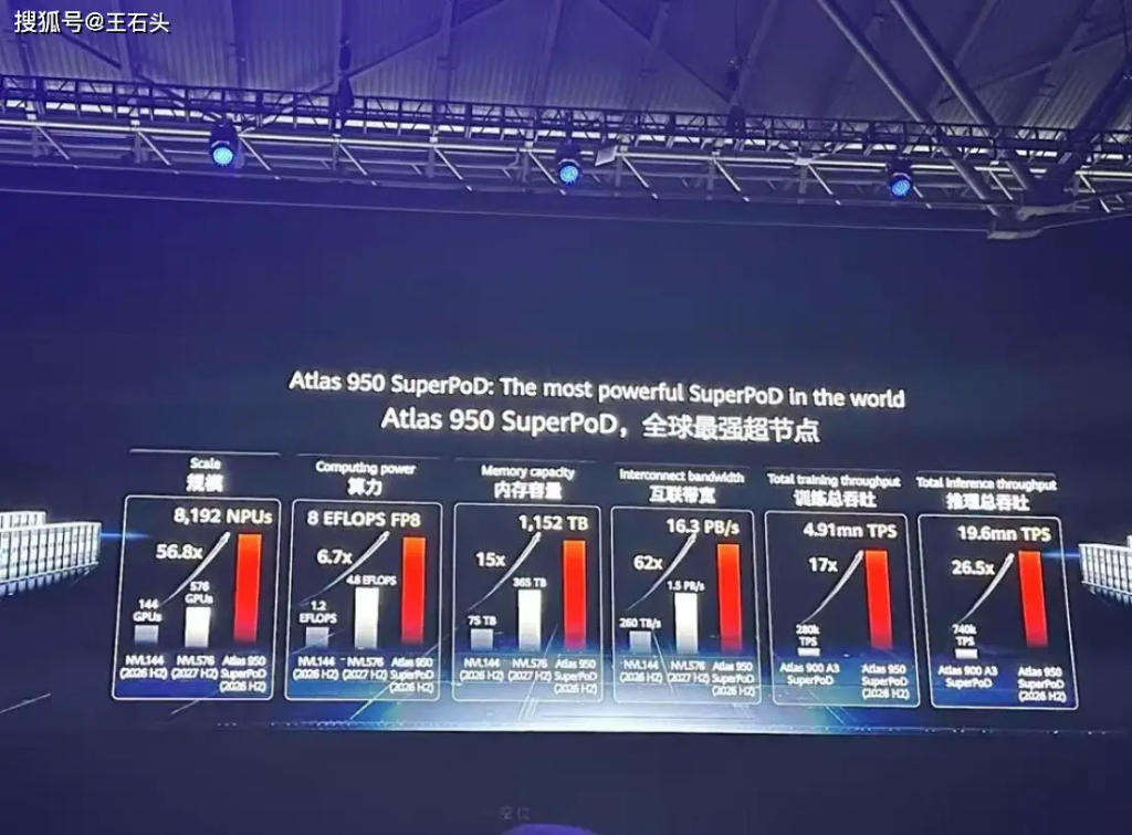 华为在这一战略中扮演了领军角色。华为轮值董事长徐直军在全联接大会上公布的昇腾芯片路线图显示,2026年至2028年将实现三代产品迭代,直指英伟达最新Blackwell架构。他坦言:”我们承认,单颗芯片算力与英伟达仍有差距”,但华为通过灵衢互联协议实现了”万卡超节点,一台计算机”的系统架构创新。具体而言,华为发布的Atlas 950 SuperPod超节点支持8192张昇腾卡,其卡规模是英伟达2026年要推出的NVL144S的56.8倍,互联带宽是其62倍。这种以集群优势弥补单芯短板的技术路线,正在改变AI芯片产业的竞争规则。