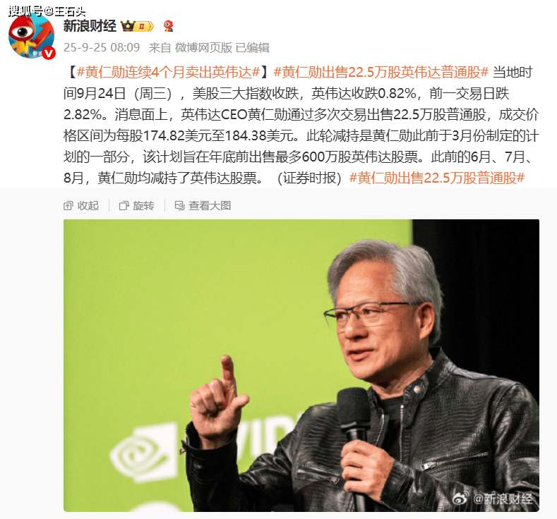 美国证券交易委员会(SEC)披露的文件显示,英伟达CEO黄仁勋自2025年6月起开启了密集减持模式。从6月20日到7月18日不到一个月时间里,他就减持逾100万股,套现约2亿美元;而自6月20日起至9月25日,黄仁勋以每次卖出约5万股或7.5万股的频率,连续4个月减持公司股票,累计套现规模已达数亿美元级别。这种减持并非临时起意,而是依据10b5-1规则进行的预设计划——该规则允许上市公司内部人士事先安排股票交易,以避免内幕交易嫌疑。表面上看,这只是高管个人财务管理的常规操作,但放在当前AI芯片产业格局剧变的背景下,这一行为难免引发市场深度解读。