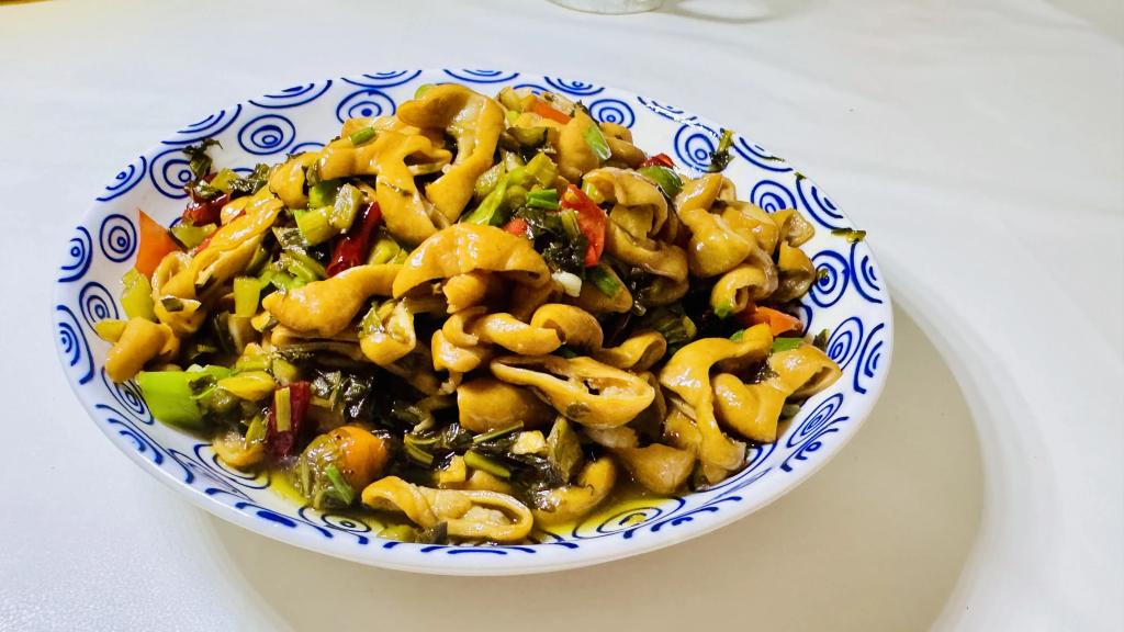正如作者在简陋环境中依然能通过美食找到慰藉——”桂花盛开之后…会因为风一动时不时飘来了阵桂花的清香,有一瞬间我也原谅了这个老破小了”[用户提供内容],简单的雪菜炒肥肠也能成为阴雨天的一抹亮色,用香辣滋味温暖家人的胃与心。